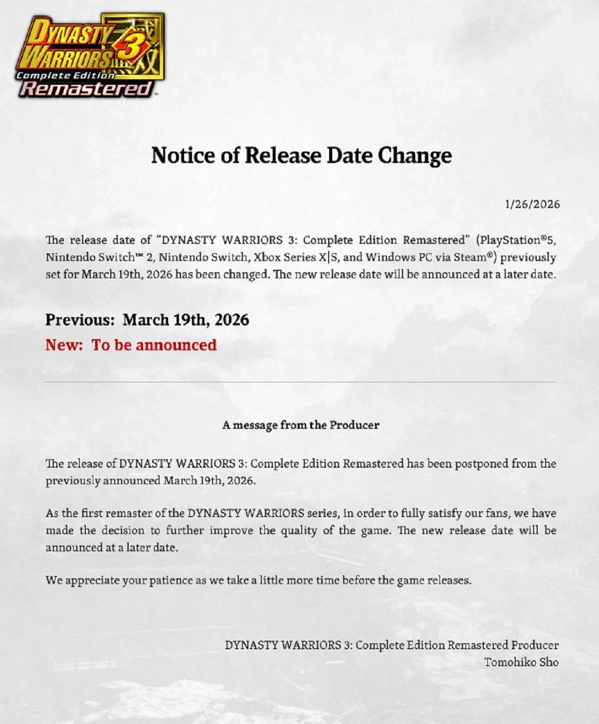 Игру решили отложить для того, чтобы улучшить качество переиздания и порадовать фанатов. Продюсер также не хочет подвести игроков из-за того, что Dynasty Warriors 3 станет первой частью серии, которая получит ремастер для современных платформ.