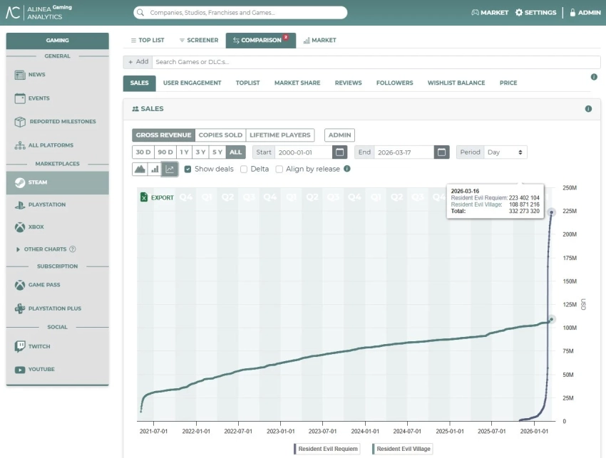 Версия для PlayStation 5 тоже неплохо продалась. Она показала внушительные 175 миллионов долларов валового дохода — на 50 миллионов меньше, чем на платформе Valve. Аналитики связывают этот разрыв с общей политикой Capcom по отношению к PC-сегменту и увеличением доли геймеров из Китая. В Steam жители «Поднебесной» составляют 15% от общего числа игроков Resident Evil Requiem.
