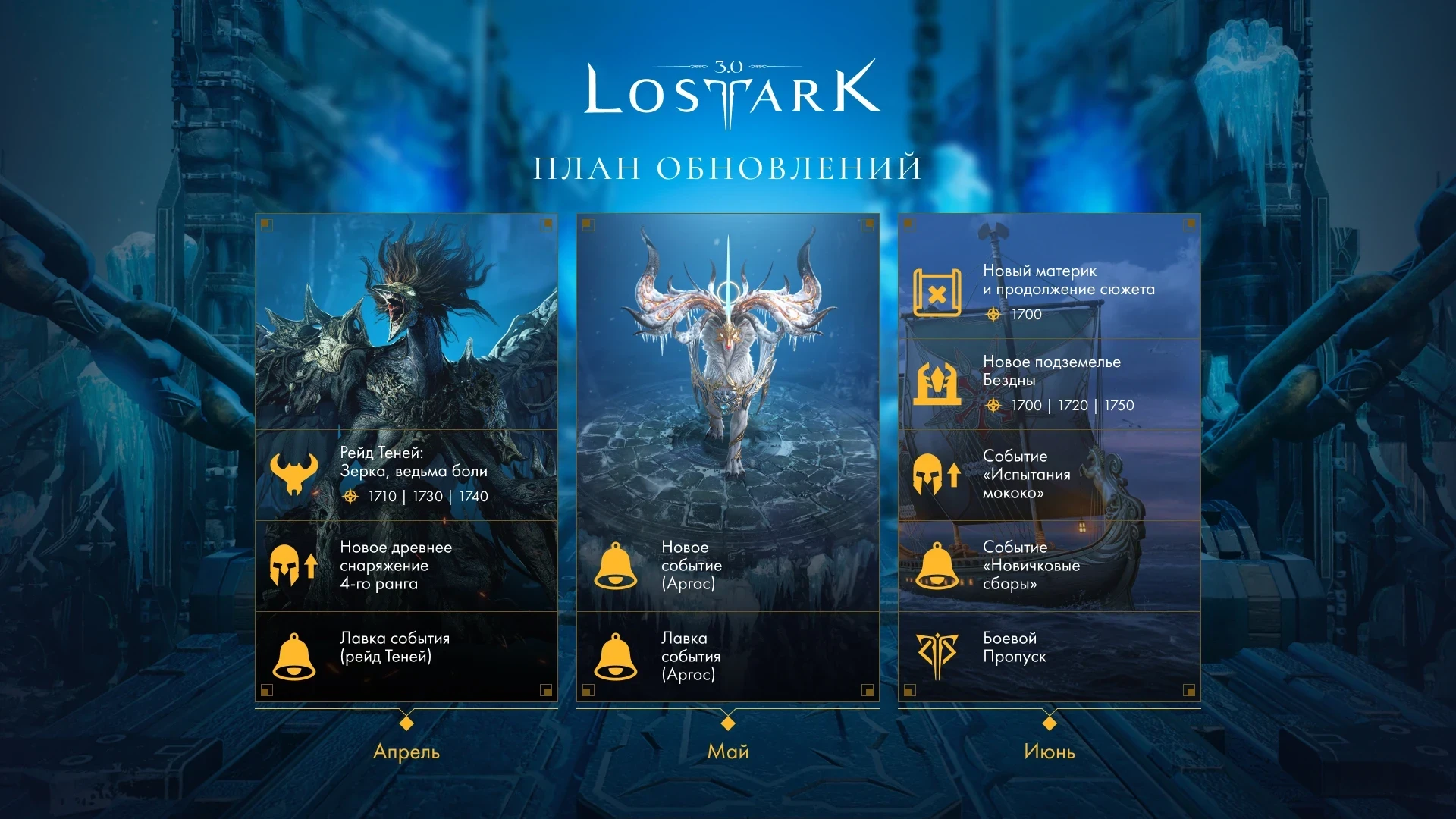 В апреле игрокам станут доступны «Рейд Теней», новое древнее снаряжение четвёртого ранга и лавка события. Кстати, сам рейд запустят без системы «Натиск». Однако в нем появится новый режим — «Кошмар», который дополнит обычный и героический уровни сложности.