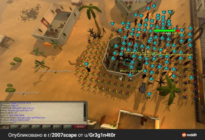 В ММО-играх часто можно встретить проявления нетерпимости, агрессии и нездорового соперничества, но в этот раз всё сложилось иначе. Сотни человек присоединились к скорбящему, чтобы выразить поддержку и дать немного утешения. Когда игрок пришёл на локацию с магазином «Zeke’s Superior Scimitars», он увидел толпу. Аватары выстроились вокруг здания и читали молитву искупления, при использовании которой над их головами появлялись зеленые сердца.