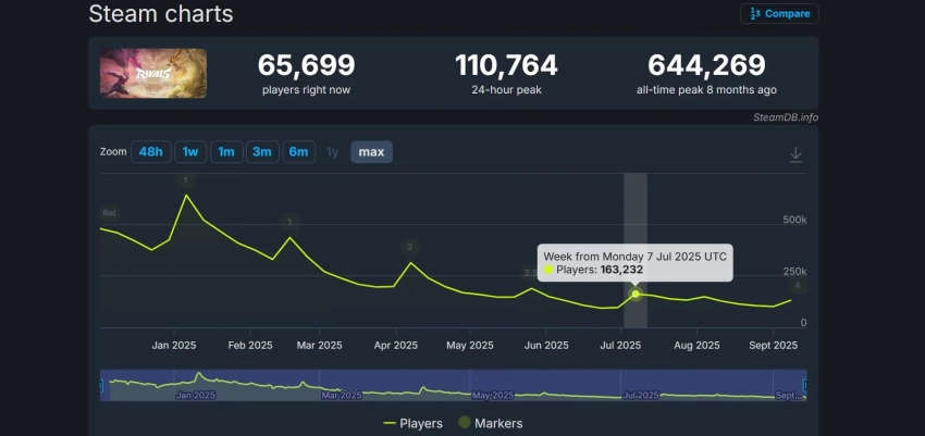 В момент старта первого сезона в январе этого года пиковый онлайн Marvel Rivals превысил 644 тысячи человек. С тех пор значение постепенно снижалось: старт второго сезона привлёк 315 тысяч человек, тогда как в июле с третьим сезоном пришло познакомиться лишь 163 тысячи человек. Между сезонами суточный пиковый онлайн также не превышает показатели первых дней с момента начала сезонов.