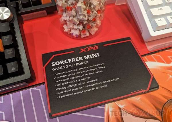 XPG также оставила немного места на стенде для своей новой линейки игровых клавиатур Sorcerer — стандартная модель представляет собой «полноразмерную» плату с форм-фактором 96 %, доступную в черном или белом цвете. Простая эстетика Sorcerer может быть нарушена несколькими (тремя) дополнительными клавишами с акцентом XPG. Серебристый диск управления, похоже, является стандартным креплением. Конструкция с прокладкой и тройным пенополиуретановым слоем обеспечивает изысканный и приятный набор текста. XPG оснастила Sorcerer специальными переключателями Red и системой RGB-подсветки на каждую клавишу (управляется и настраивается с помощью программного обеспечения XPG Prime).