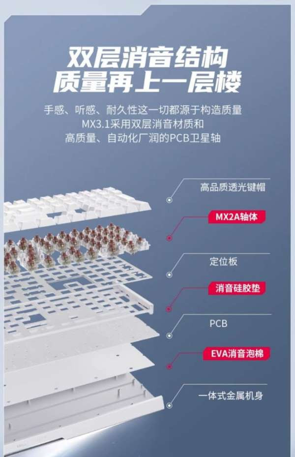 Подключение клавиатуры осуществляется через съемный USB-C кабель в оплетке. Переключатели MX2A, используемые в этой клавиатуре, отличаются стабильностью и высоким качеством, имеют технологию золотых перекрестных контактов и новую бочкообразную структуру шумоподавляющей пружины.